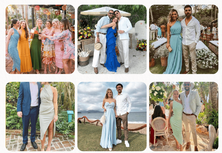 O traje sugerido é esporte fino, em harmonia com a proposta de um casamento diurno à beira-mar.